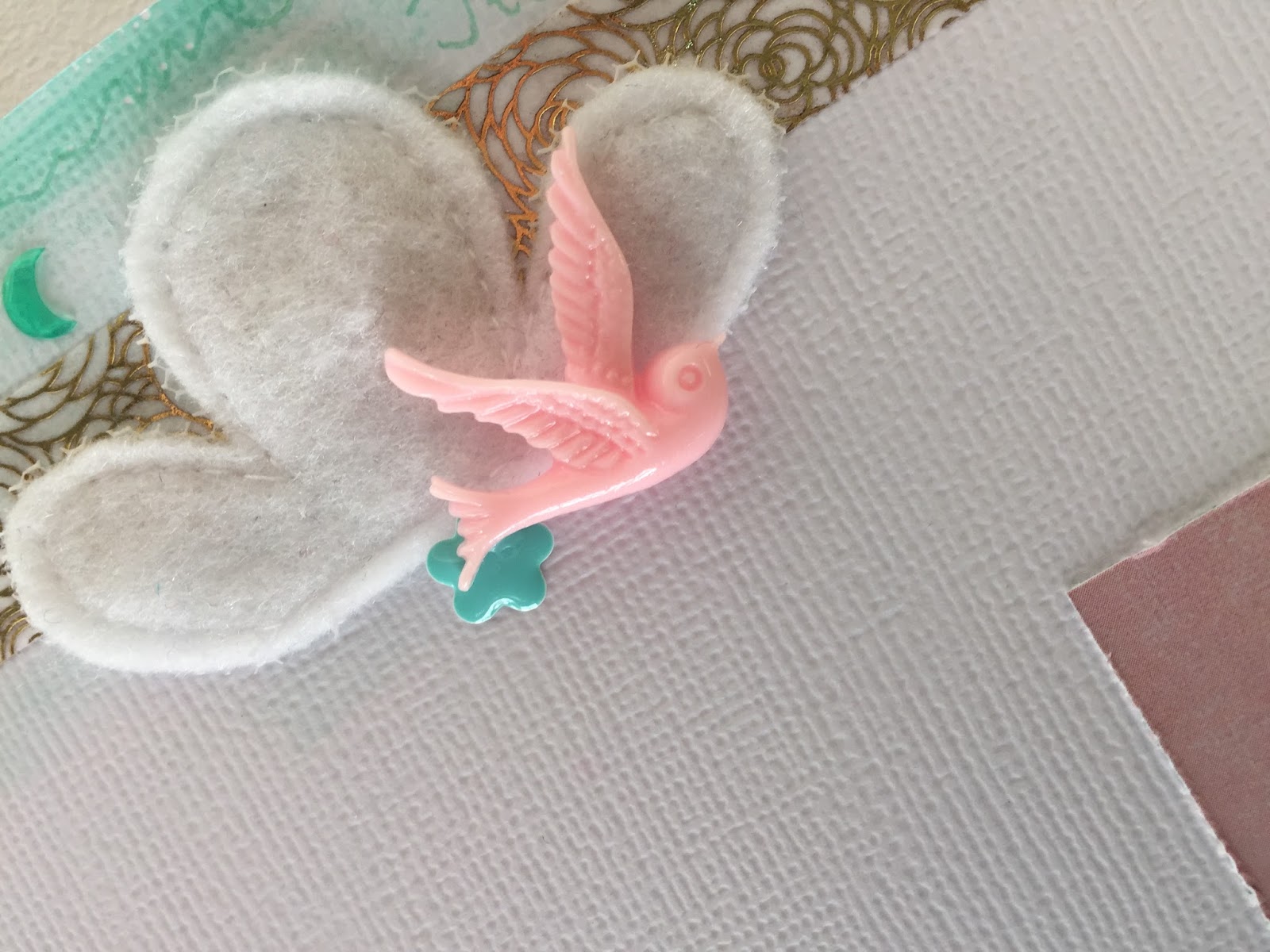 I also used paper flowers, resin flowers, old fabric flag and enamel shapes/dots, all from D-lish Scraps.
